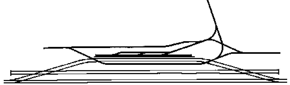 Oberhalb des regelspurigen Anschlussgleises (→ Doppellinie) befindet sich die zweigleisige Schüttrampe der Feldbahn (→ Einfachlinie) und darunter ein Umladegleis, wie es bei der allgemeinen Rampenanordnung unter a) beschrieben ist.